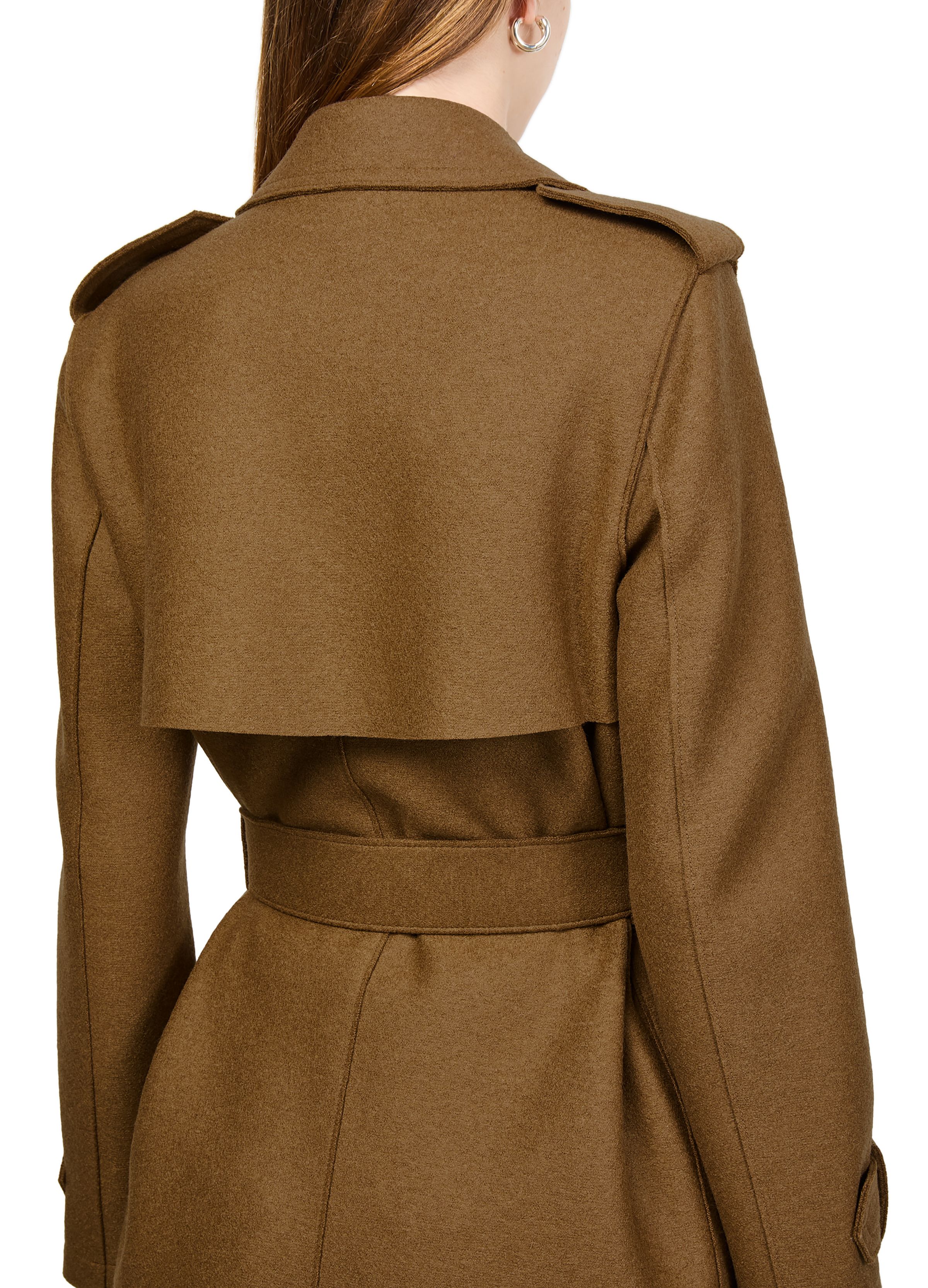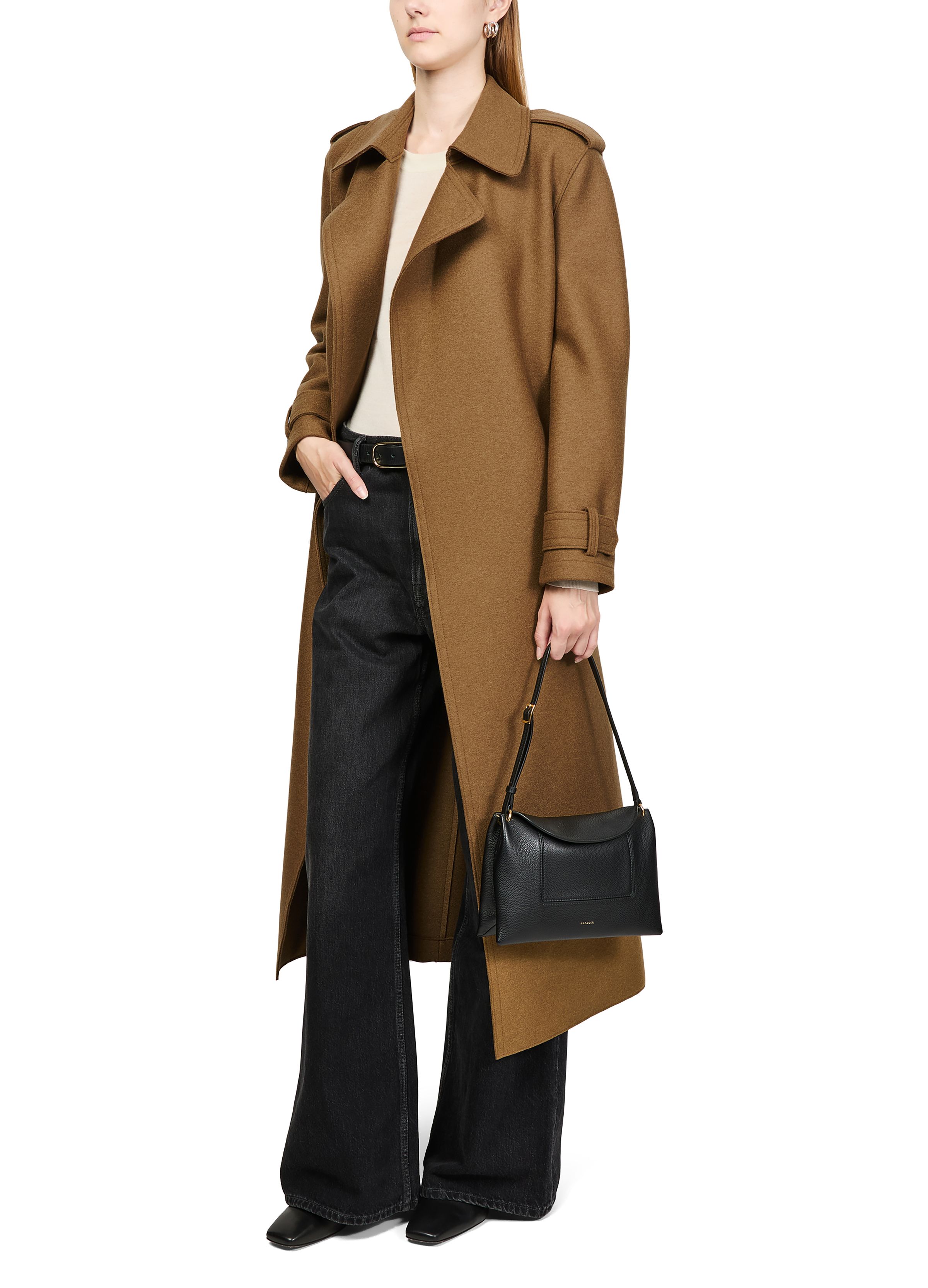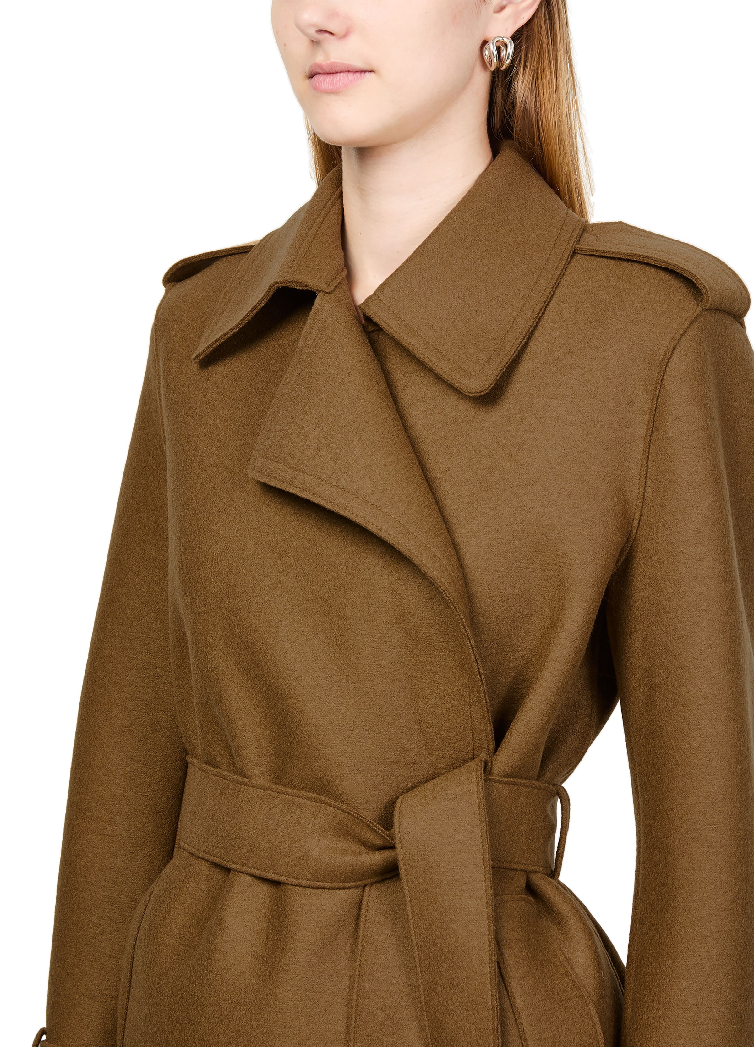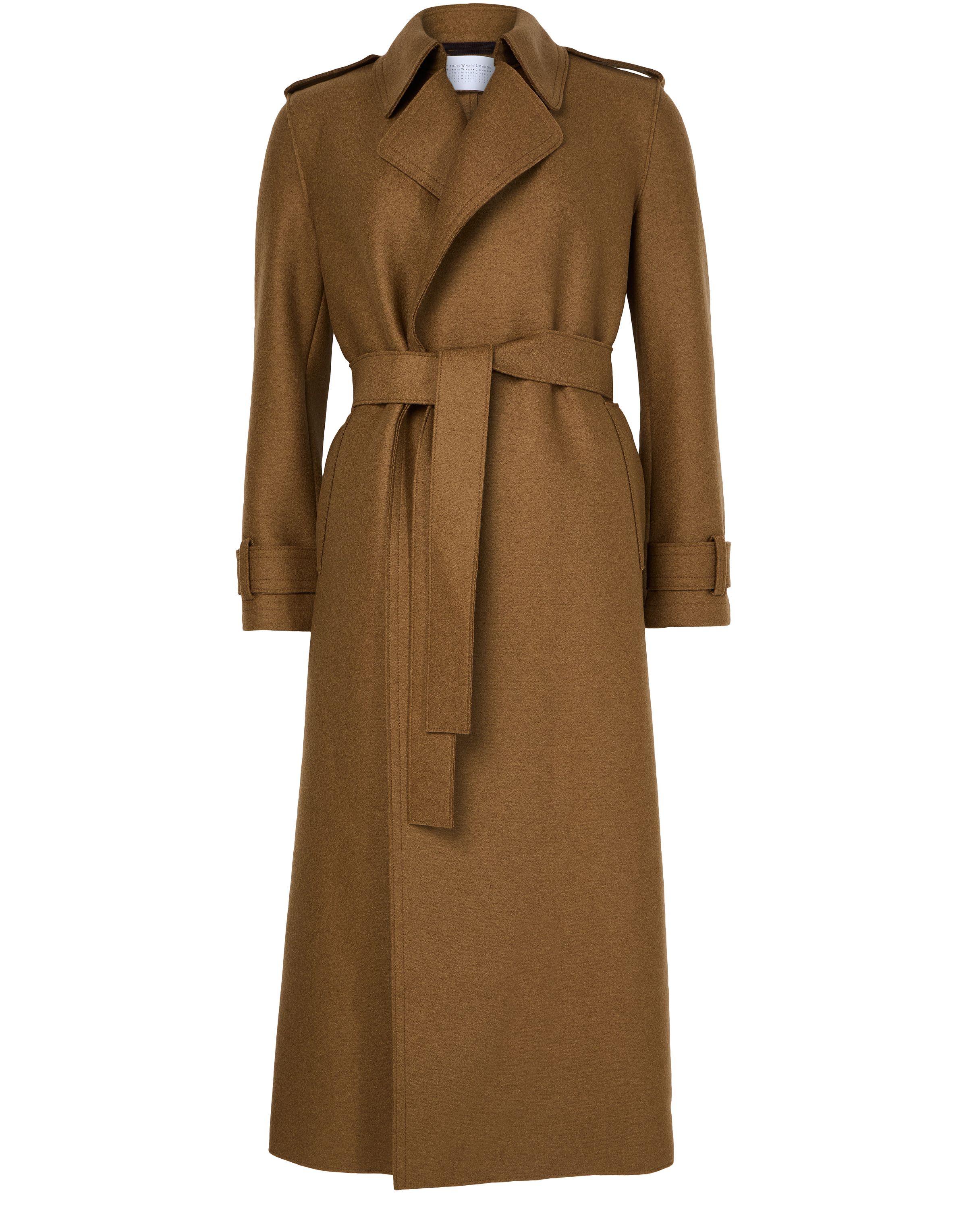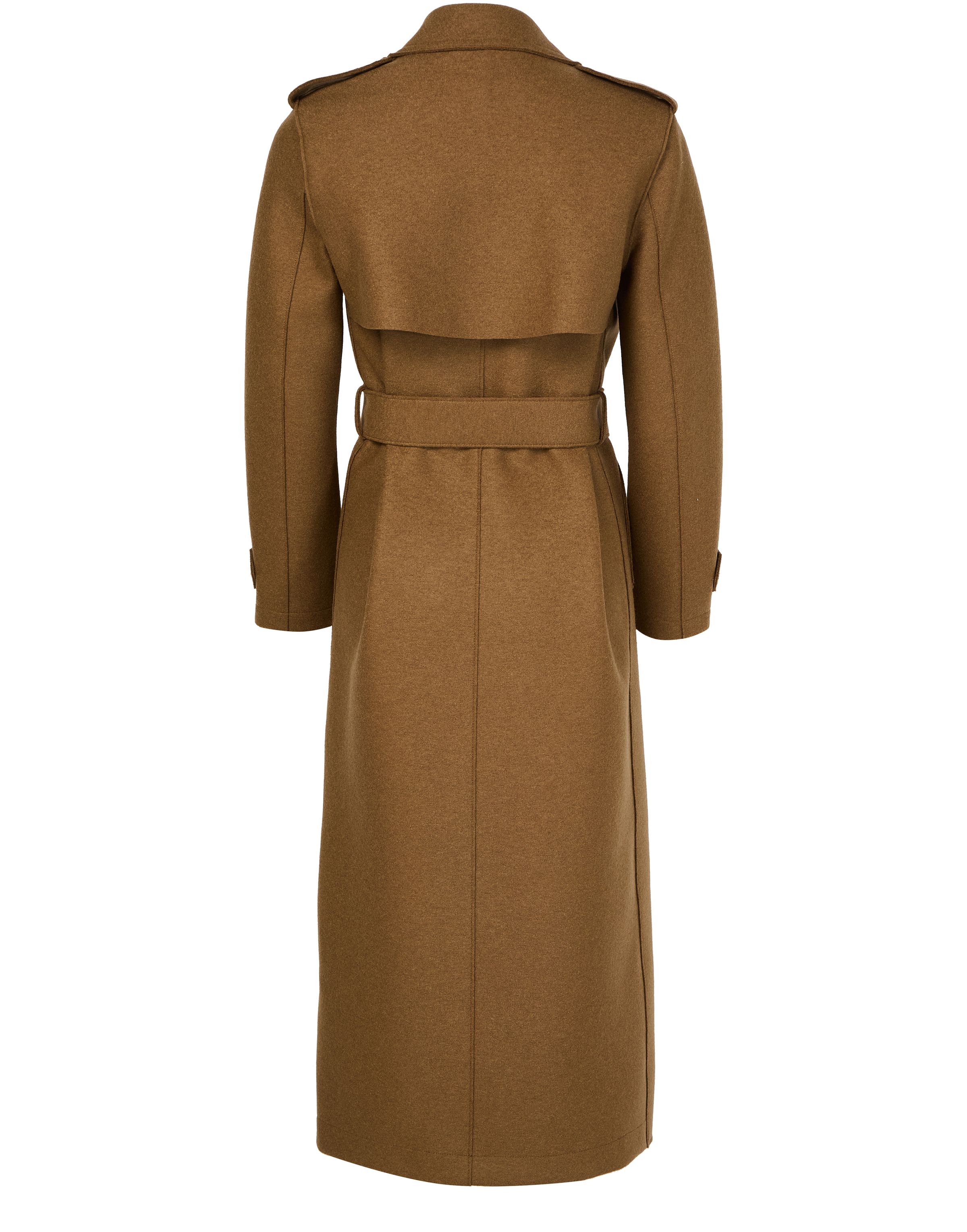 Double-stitched long trench in pressed wool