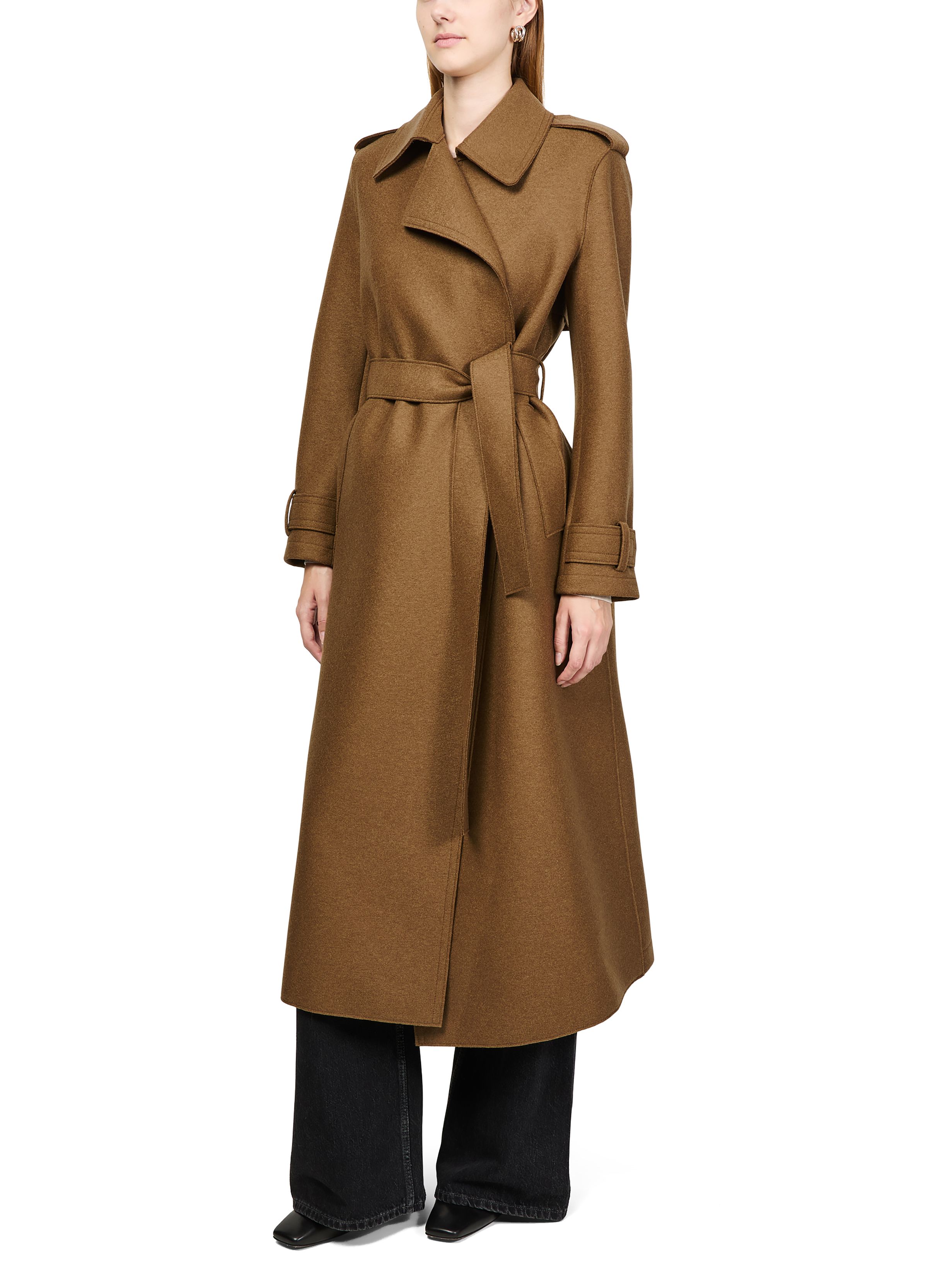 Double-stitched long trench in pressed wool