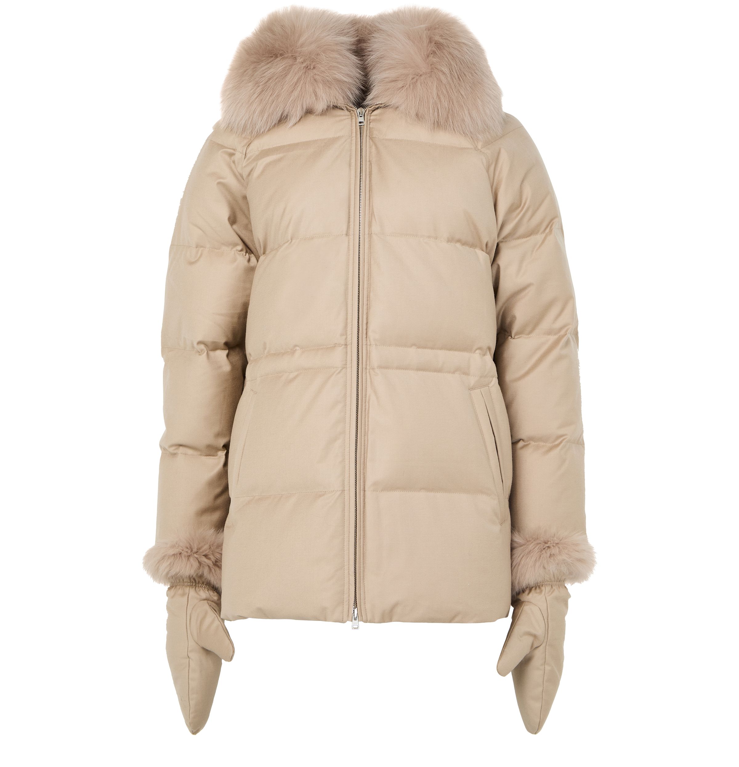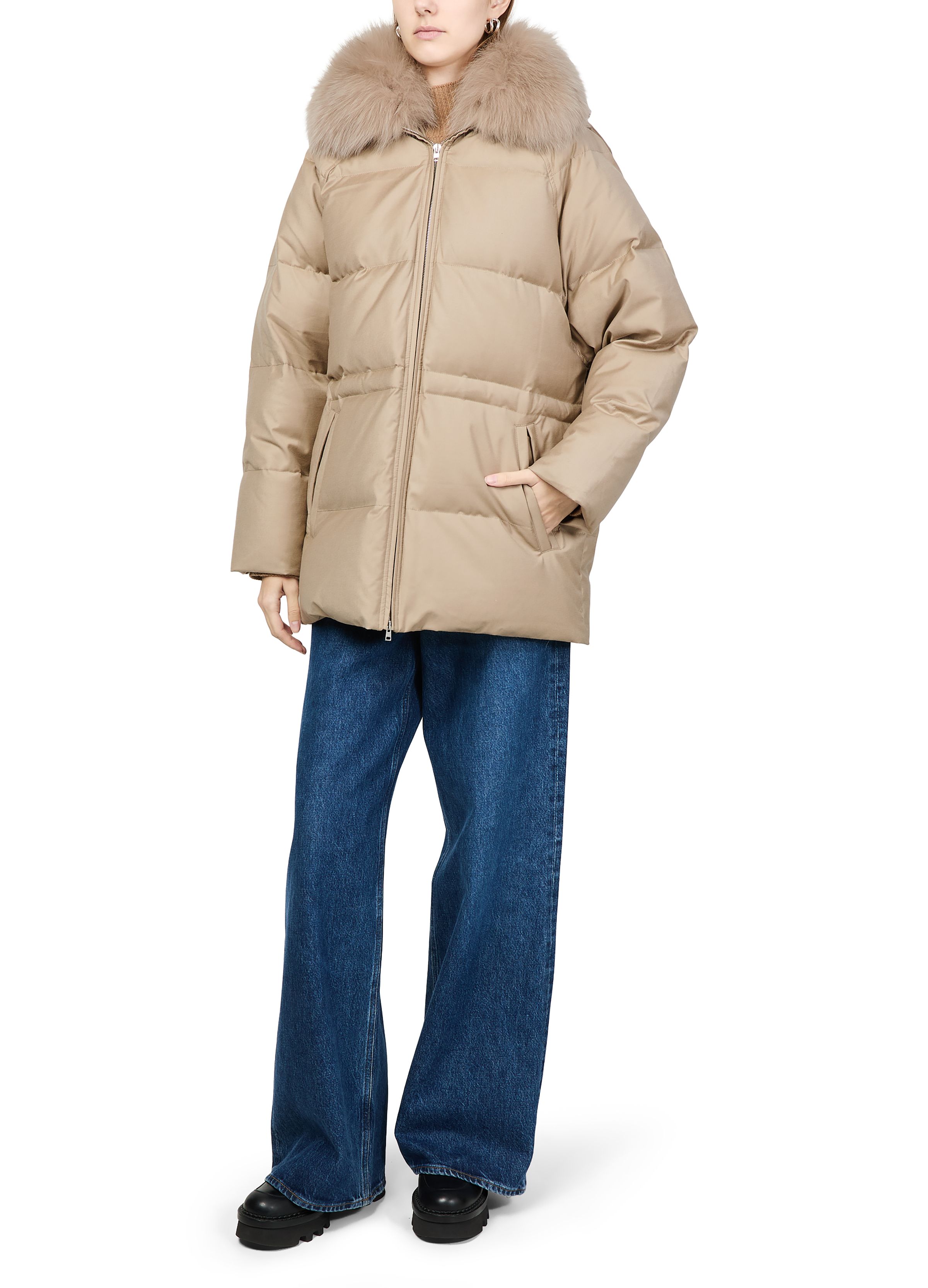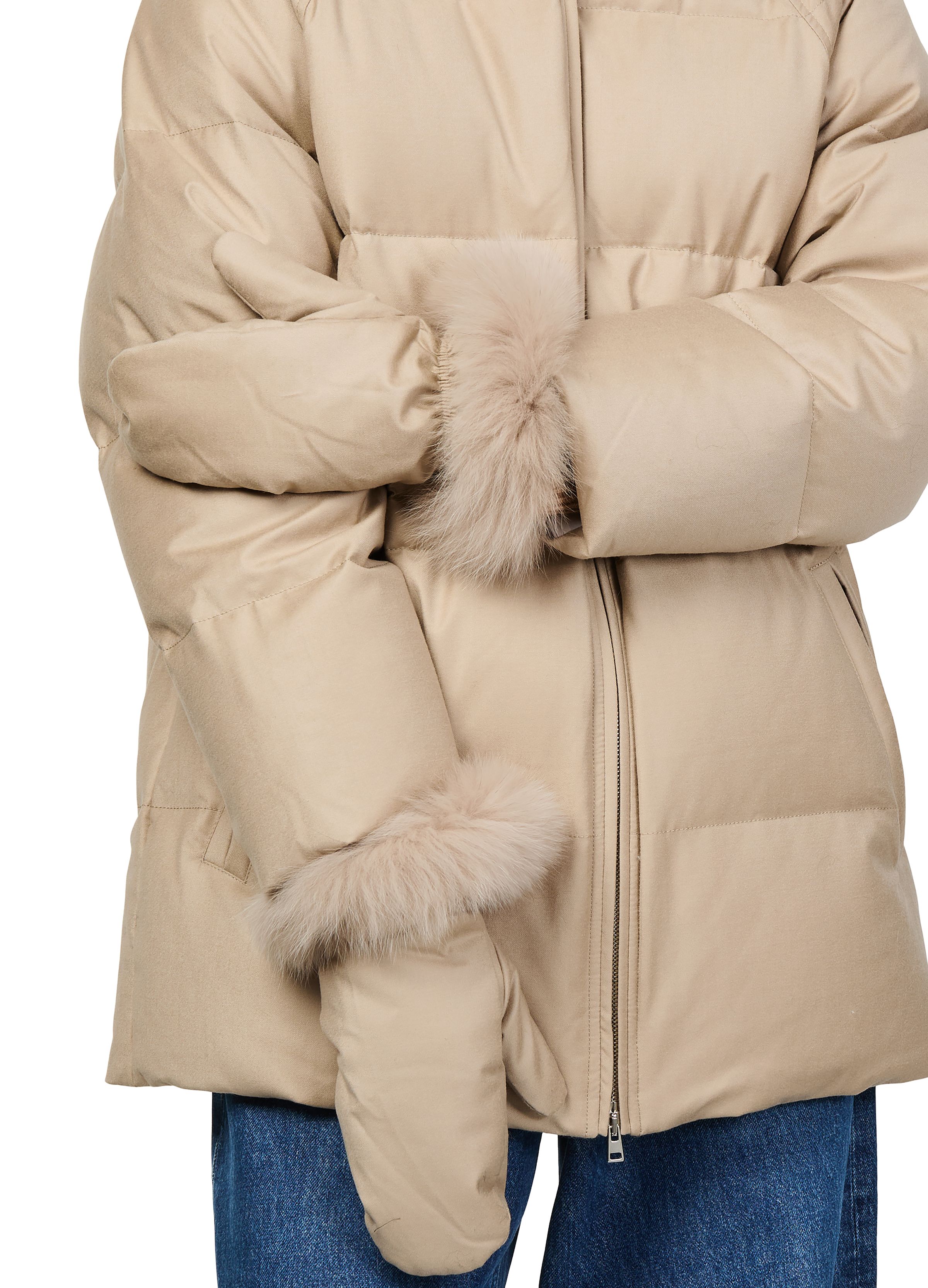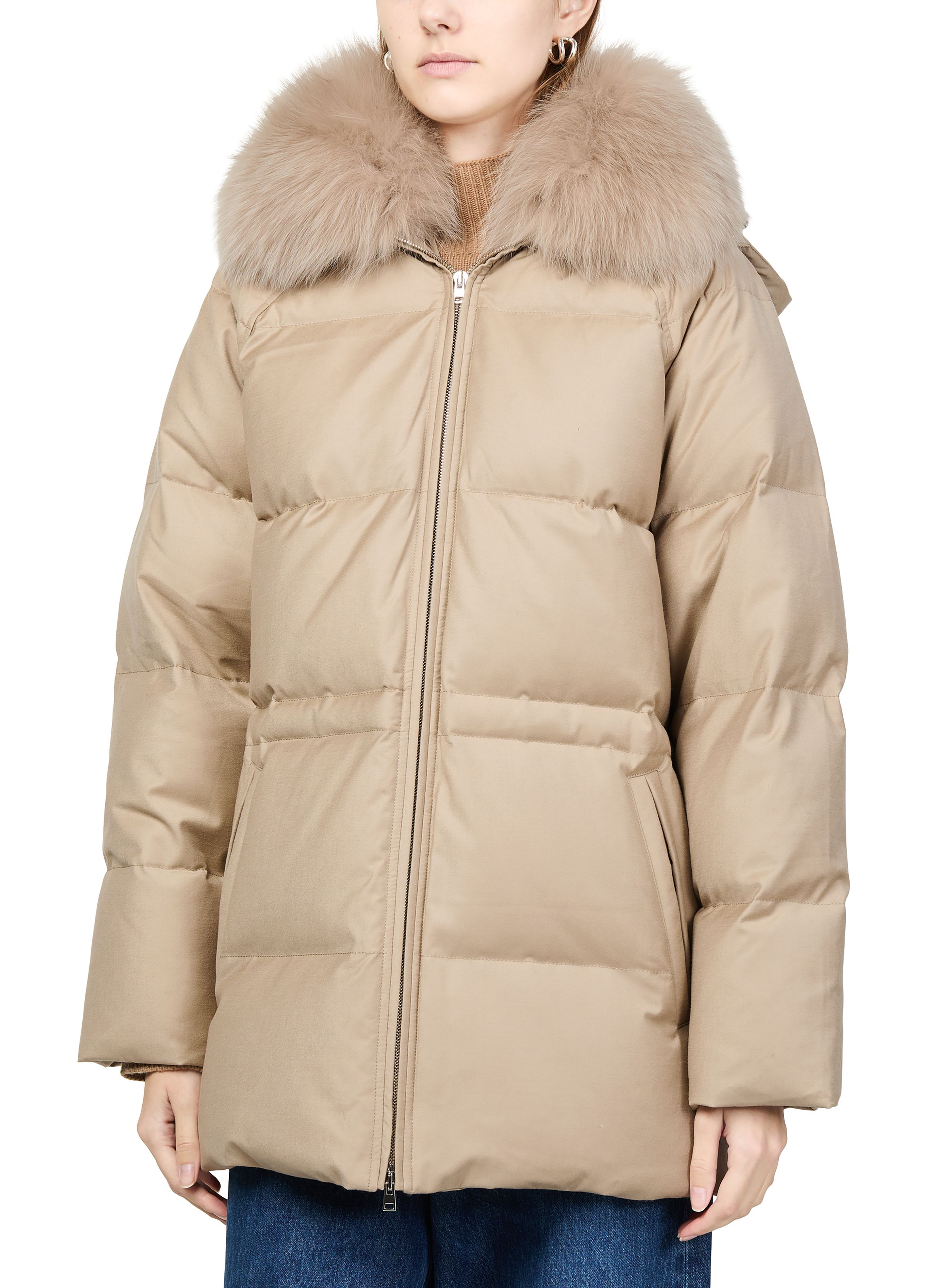 Puffer jacket with a fox fur collar - Beige